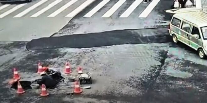 ورصد مقطع فيديو نشرته الصحيفة لحظة قيام مجموعة من العمال بإجراء عملية صيانة جانب بالوعة في وسط الطريق قبل أن يحدث انفجار تحت سطحه ويؤدي إلى تحطم بعض السيارات وإلقاء عدد من المارة بعيدا.