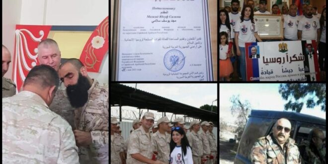 كما تم تكريم ضابط سوري برتبة مقدم يدعى “مجد يوسف سلامي”، المنحدر من قرية “درميني”، التابعة لمنطقة جبلة في محافظة اللاذقية، من قبل رئيس العمليات القتالية في سوريا العقيد “باشاروف” وذلك “تقديرا للتعاون وتقديم المساعدة الفاعلة للقوات الروسية وتأمين السلام في سوريا”.