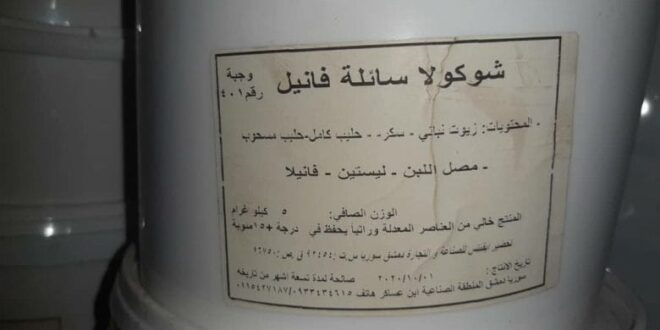 ضبط عناصر التجارة الداخلية وحماية المستهلك بريف دمشق معملاً لصناعة الشوكولا في منطقة السبينة بداخله 16 عبوة شوكولا سائلة زنة الواحدة 5 كغ منتهية الصلاحية بالإضافة إلى 10 صناديق من مادة حبيبات الشوكولا نصف مصنعة بدون بيانات .
