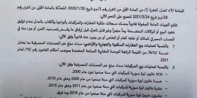 حيث أصدر رئيس مجلس الوزراء حسين عرنوس منذ يومين قراراً ألزم بموجبه الجهات العامة المخولة قانوناً بصك سجلات ملكية العقارات والمركبات بأنواعها والكتاب بالعدل بعدم توثيق عقود البيع أو الوكالات المتضمنة بيعاً منجزاً وغير قابل للعزل قبل إرفاق مايشعر بتسديد الثمن أو جزء منه في الحساب المصرفي للمالك أو خلفه العام أو الخاص أو من ينوب عنه قانوناً.