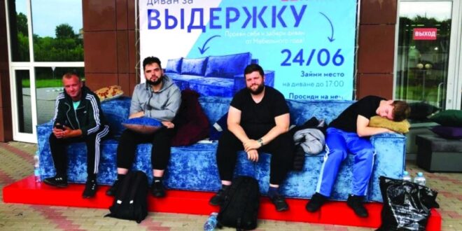 Three Russians have been sitting on a sofa in Belgorod for the third day. But it’s not a political action, but an advertising: the local store promised to give this furniture to the one who stays the longest. Probably, this is how the training of elite armchair warrior looks like pic.twitter.com/LUAHyDbbBE